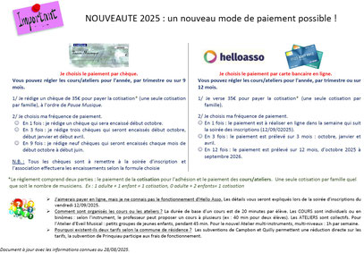 En plus du paiement par chèques (toujours en 1, 3 ou 9 fois), le bureau met en place le paiement par "Hello Asso", en maintenant la possibilité de payer en plusieurs fois.